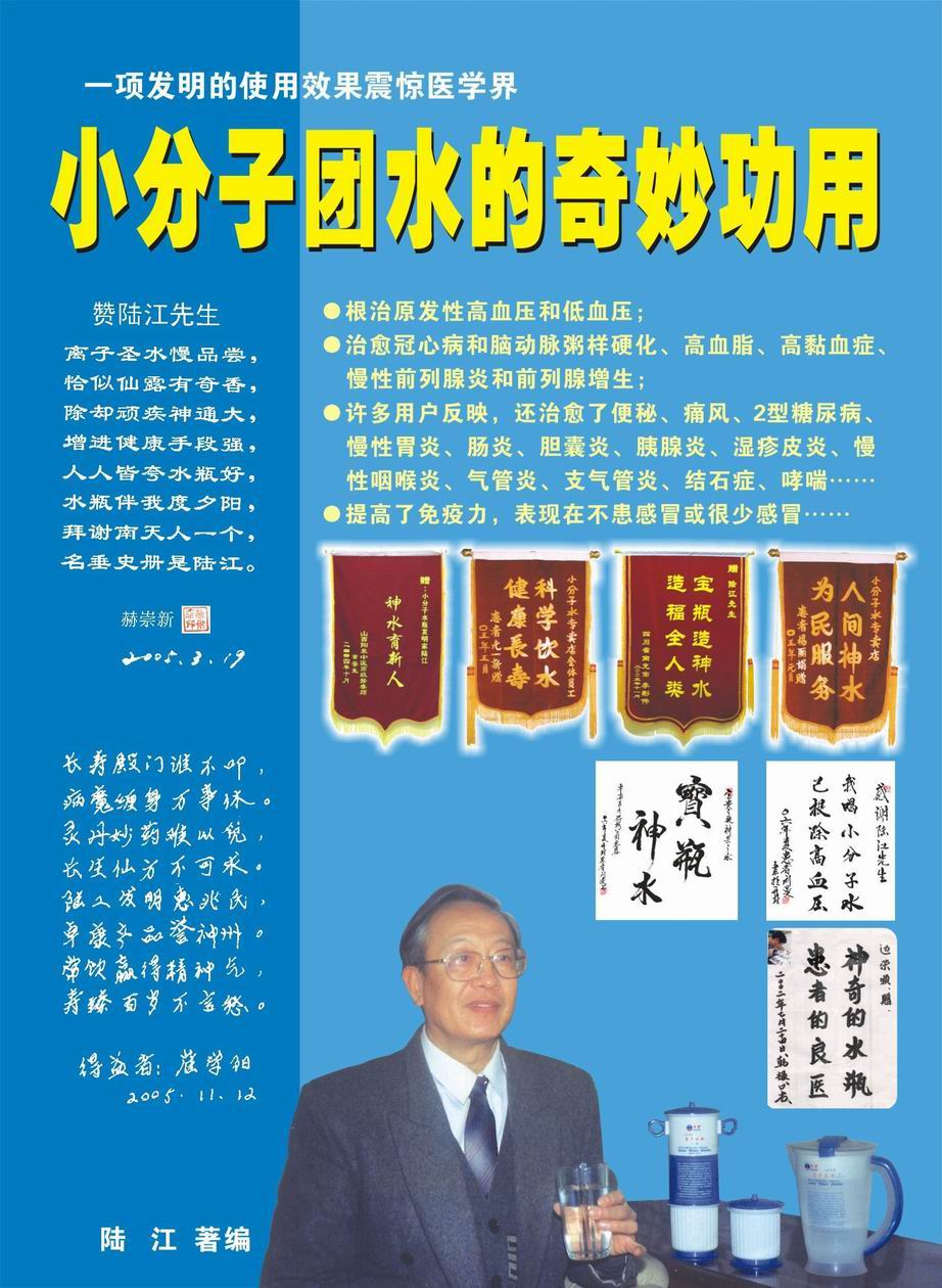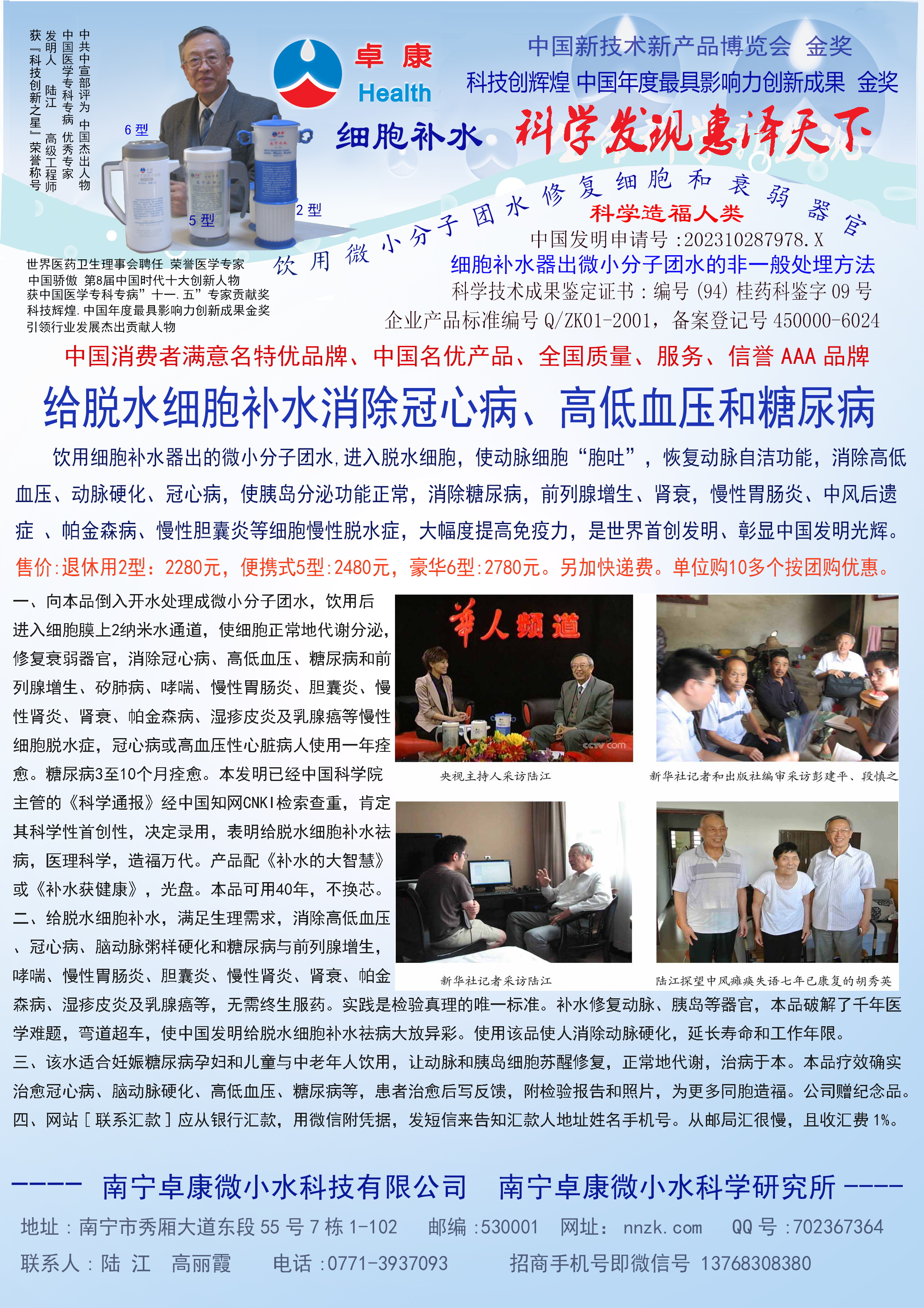 人類幾千年來患以上病癥需終生服藥,幾十年也不能治愈。可是我國南寧的高級工程師陸 江,于1990年想根治高血壓,研究發(fā)明了離子水瓶,處理出微小分子團水供飲用,經(jīng)過醫(yī)院臨床試用和專家鑒定,1999年獲中國發(fā)明專利權(quán),產(chǎn)品于2000年投放市場后一直跟蹤調(diào)查,據(jù)全國各地用戶反饋:祛除了高低血壓、糖尿病和冠心病,并使前列腺增生、咽喉炎、鼻竇炎、慢性氣管炎、支氣管炎、矽肺病、哮喘、慢性胃炎、腸炎、慢性膽囊炎、慢性腎炎、腎衰、膀胱炎、便秘、痔瘡、風(fēng)濕性關(guān)節(jié)炎和濕疹皮炎及中風(fēng)后遺癥等病癥不藥而愈。為什么喝微小水能治20多種病?陸 江從1991年德國科學(xué)家發(fā)現(xiàn)細(xì)胞膜水通道僅為2納米獲得啟發(fā),認(rèn)為多種器官患病是因細(xì)胞脫水,不能正常代謝和分裂增殖,才使器官細(xì)胞減少致衰弱萎縮而形成細(xì)胞缺水性病癥。22年來的實踐有力地支持了“細(xì)胞脫水致病”這一重要論點,表明喝微小水可滿足細(xì)胞的生理需求,補水就能祛病,是生命科學(xué)新亮點。